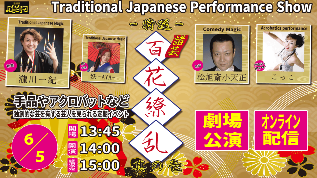 出演者:瀧川一紀(和妻)/松旭斎小天正(コメディマジック)/こっこ(ユニパフォーマー)/妖-AYA-(和妻)