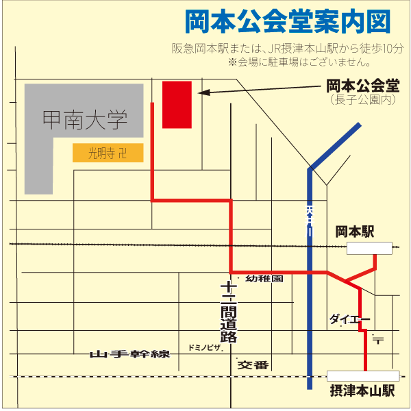 会場には駐車場がないので、阪急岡本駅・JR摂津本山駅から徒歩でお越しください